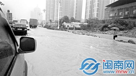 双龙路梅岭街道路段积水成河海都讯 不到两个小时,多处路段积水,10多辆小车熄火泡在积水中。昨天下午3时起,晋江内坑、磁灶和安海三镇突降暴雨,出现交通拥堵。