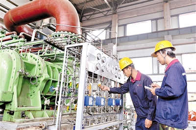 近日,工作人员在检测压缩机阀门安装情况。国内单套规模最大的焦炉煤气制液化天然气项目落户迁安九江焦化公司,该项目属于煤化工链条延伸项目和循环经济项 目。项目自2014年1月正式开工,一期计划建设年产20万吨LNG液化天然气生产线;二期计划建设年产30万吨LNG液化天然气生产线。目前,一期工程 已进入收尾阶段,计划10月份投产。能源网 http://www.aeenets.com/ 【