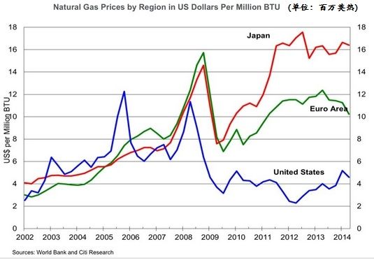 日本的天然气价格异常的高。在2011年3月福岛第一核电站事故爆发后,日本已经相应地缩小了核能的使用规模,因此日本能源成本已经成为日本经济更加沉重的负担。日本现在正摆脱经济滞胀。